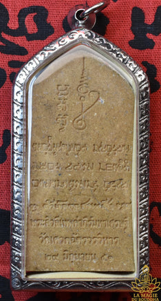 Cette grande amulette de Phra Siwali, modèle Thep Kampi Mahaséti, fut consacrée lors d’une grande cérémonie le 29 juin 1998 au Wat Sawetachat Worawihan à Bangkok. Réalisée en pâte sacrée, elle met en valeur l’image de Phra Siwali tenant son bâton de pèlerin et son sac d’aumône, symbole de prospérité et de chance infinie.