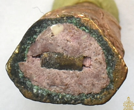 Le Phra Kling Phra Yulai, inspiré du Bouddha de médecine (Bhaiṣajyaguru), symbolise la guérison, la longévité et la prospérité. Dans cette édition spéciale Roon 1, la statuette en alliage doré porte un petit takut Mahalap (sceau de chance et de succès) encastré dans sa base, conférant à l’amulette un pouvoir renforcé de fortune et de protection du foyer.