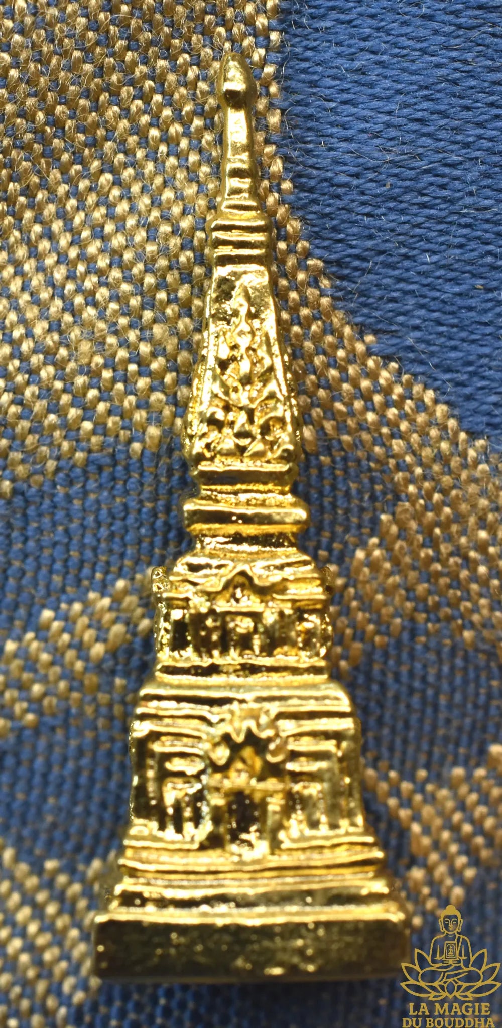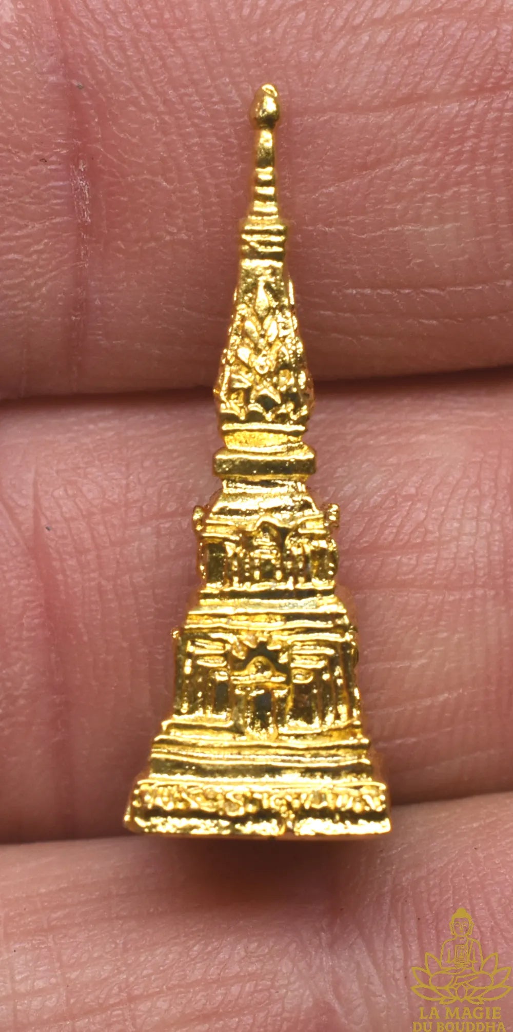 🌟 Amulette dorée représentant le célèbre chedi de Phra That Phanom, dans la province de Nakhon Phanom. Cette petite pièce raffinée a été produite en 2012, en utilisant une matière sacrée peu commune : de l’or fondu provenant des offrandes déposées par les fidèles au pied du stūpa.