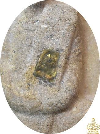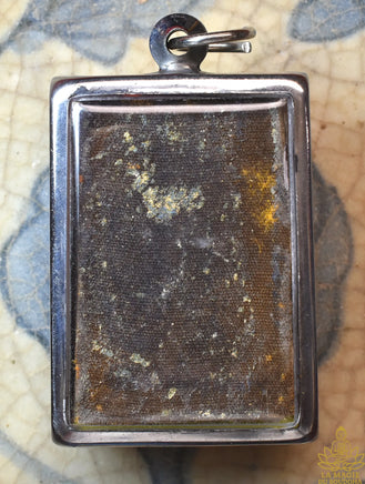 Cette amulette exceptionnelle se distingue par son dos recouvert d’une relique de tenue de moine de Luang Phor Doem, aujourd’hui profondément noircie par le temps et ornée de traces anciennes de feuille d’or. La face avant présente la figure sobre et puissante du maître en méditation, incrustée d’un petit insert sacré yant en métal doré.