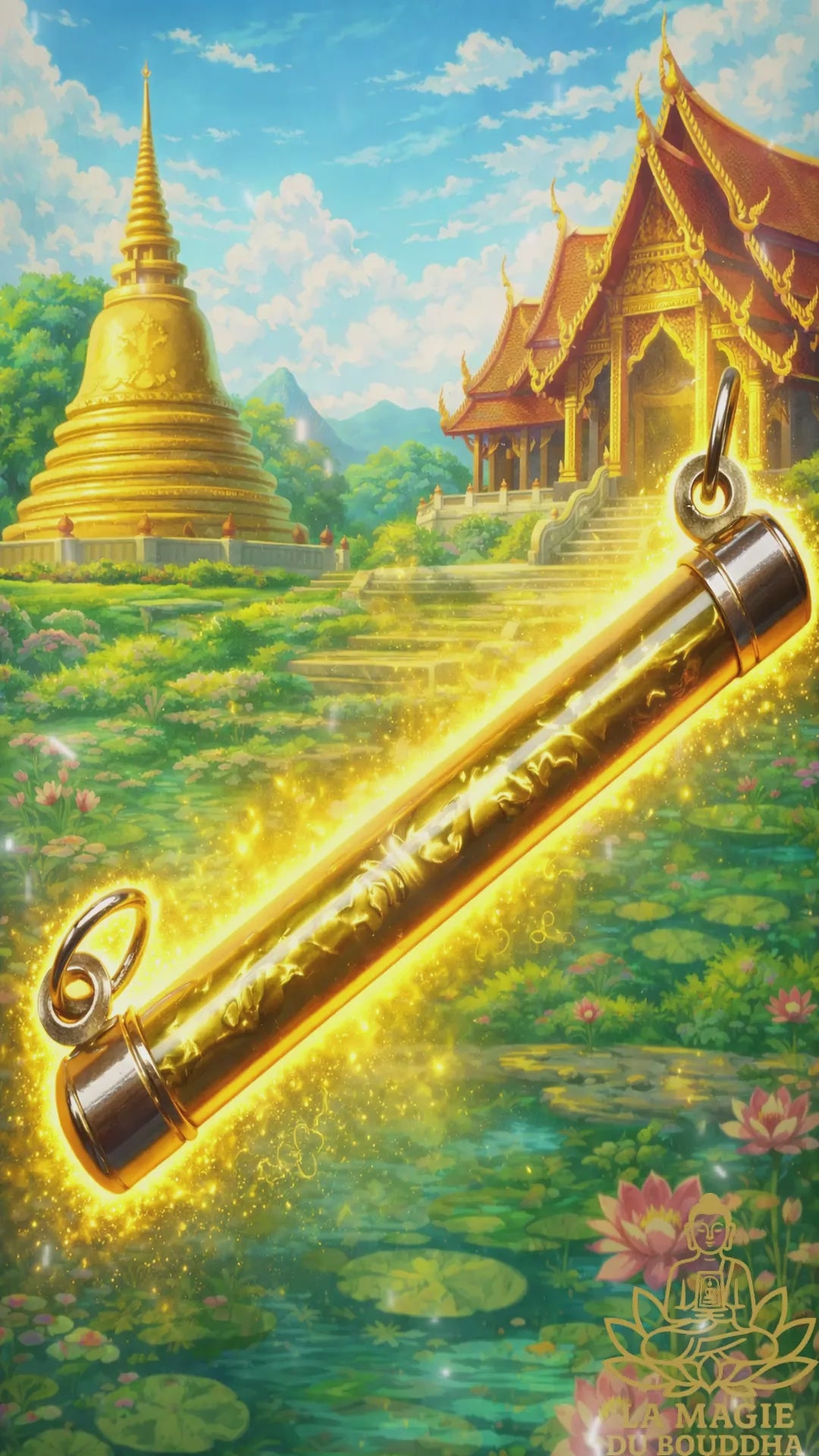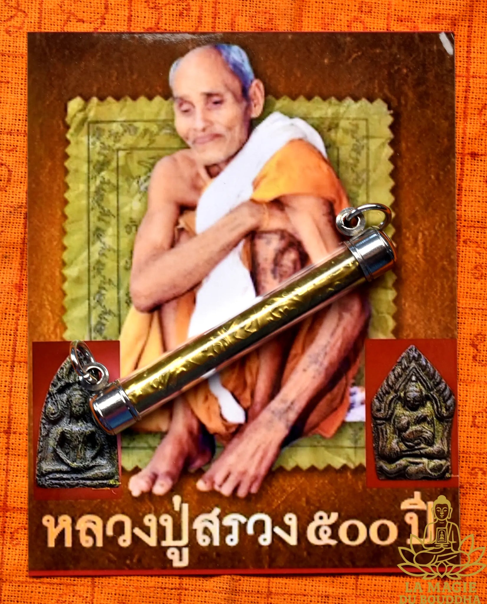 Cette rare takut dorée a été fabriquée à la main par le très vénérable Luang Phor Suwang du Wat Prai Pathanna, dans la province de Sri Saket. Présentée dans un reliquaire tube protecteur, elle renferme un rouleau sacré réalisé selon la tradition ésotérique thaïlandaise.