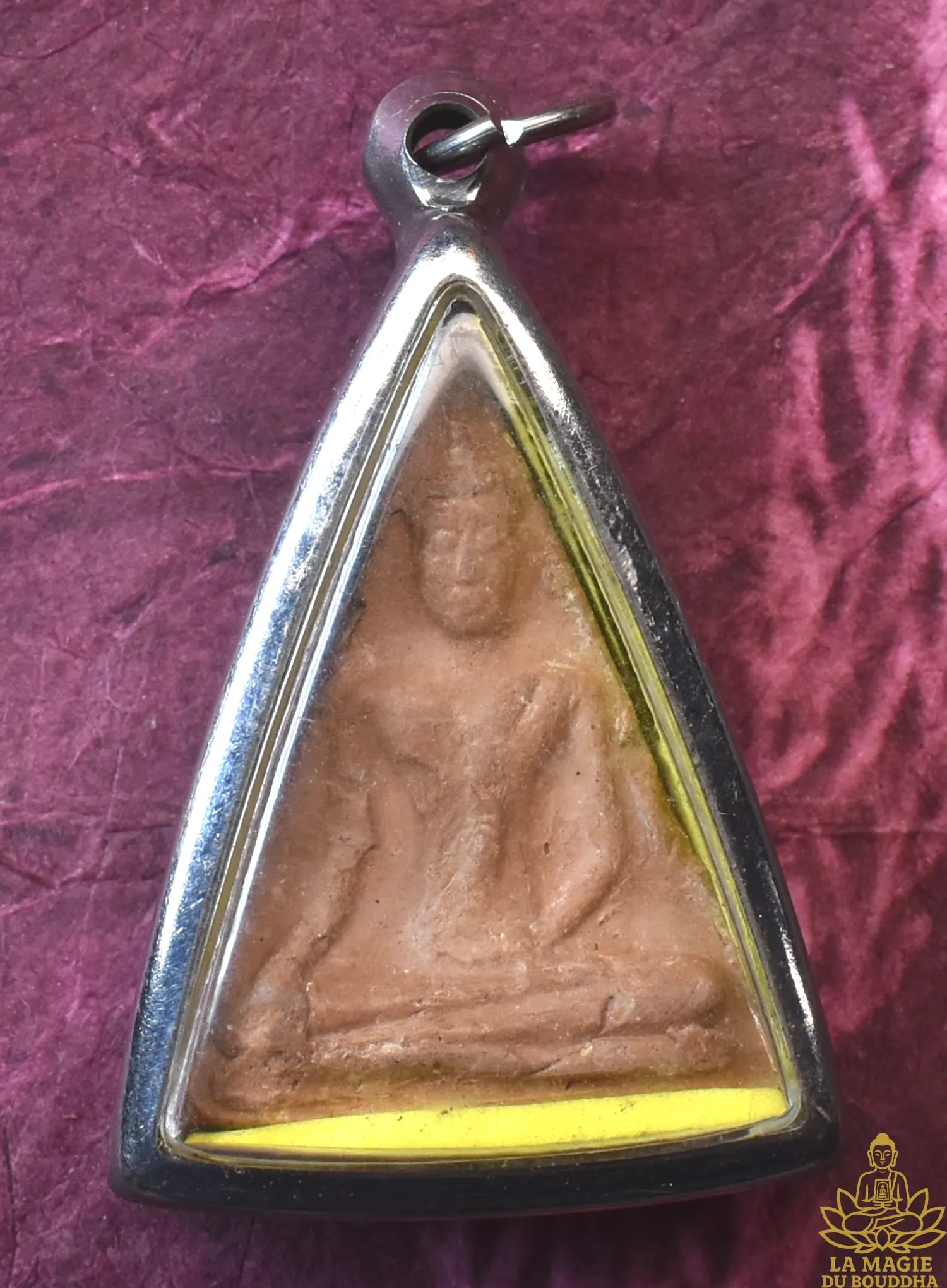 Le Bouddha est ici représenté dans la posture de méditation, moulé dans une argile sacrée mélangée de poudres sacrées, abritée dans un reliquaire triangulaire en métal poli. Chaque pièce a été moulée à la main dans des moules anciens en bois par les moines du Wat Thung Krajet et est donc complètement unique.