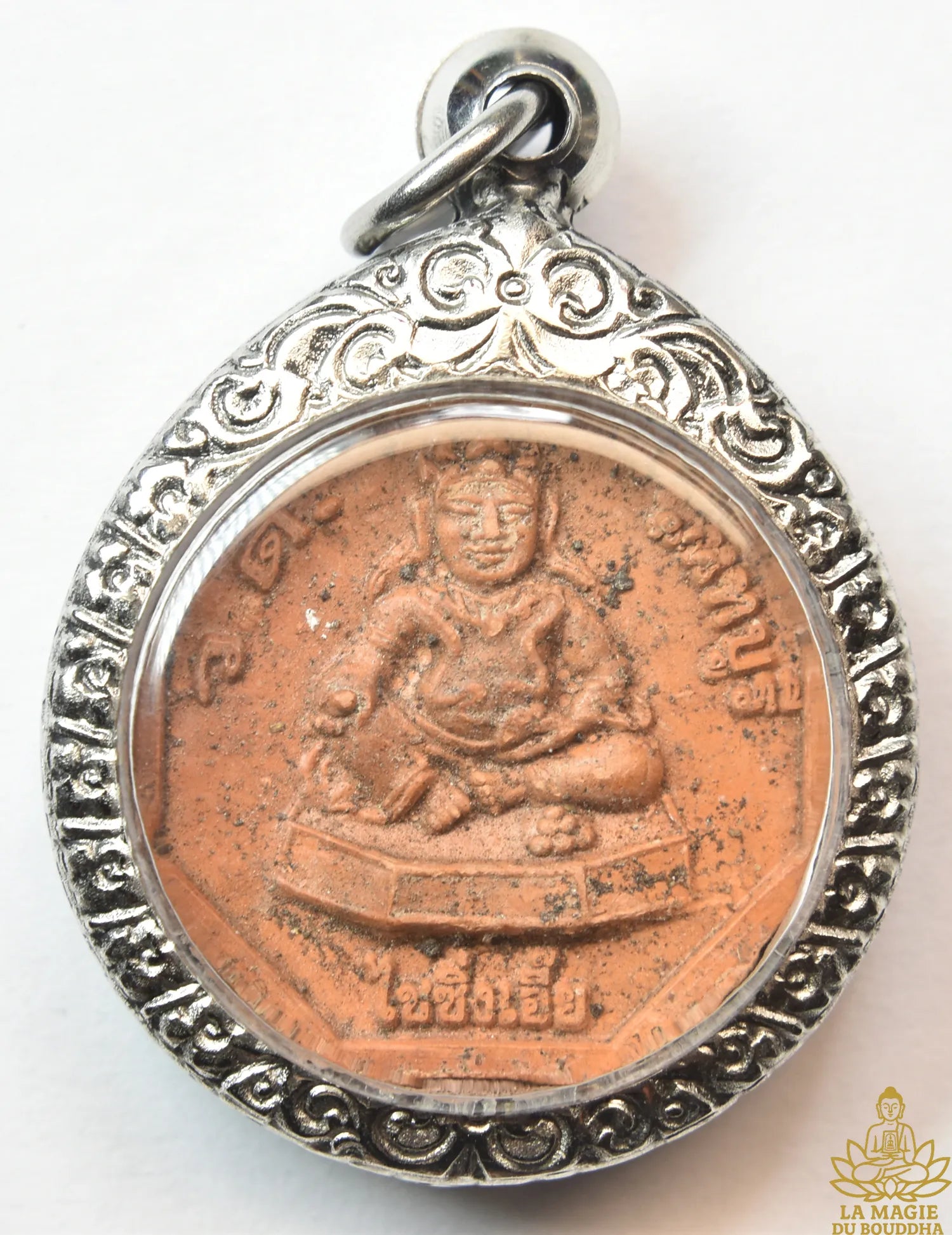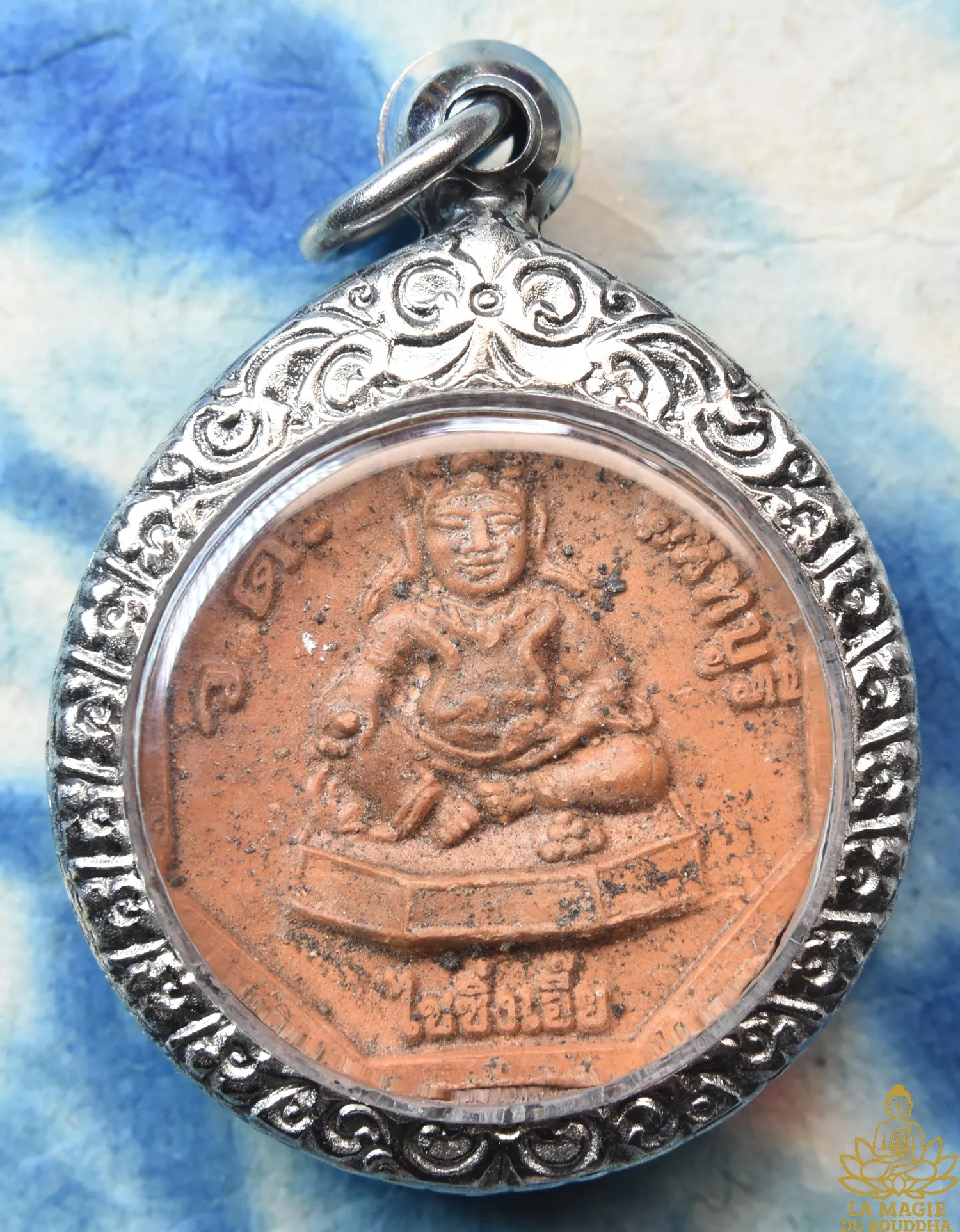 Cette amulette en argile rouge représente Kubéra, le dieu de la richesse et des trésors, très vénéré dans les traditions bouddhistes et hindouistes. Il est assis, tenant ses attributs de prospérité, tandis qu’au bas de l’amulette apparaît l’inscription thaïe โชคชัย (Chokchai), qui signifie « prospérité victorieuse ».