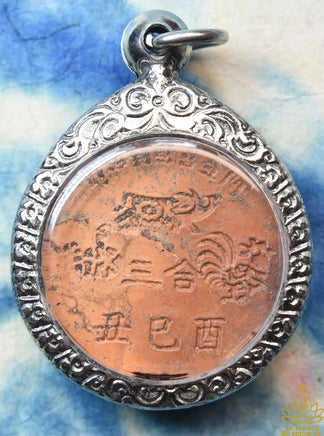 Au revers, on découvre un décor marqué d’astrologie chinoise : les signes du Serpent, du Coq et du Bœuf, associés à l’inscription 三合 (San He – Triple Harmonie). Cet ensemble symbolise un trigone astrologique très favorable dans le zodiaque chinois, réputé pour attirer la chance, la prospérité et un équilibre durable.