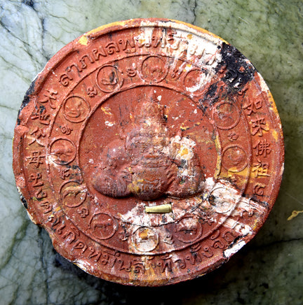 Sur la face avant, le Bouddha est représenté assis en méditation, doré et entouré d’inscriptions sacrées. Le revers présente PHra Rahu, des cercles mystiques, inscriptions khom et thaï, ainsi qu’un sceau protecteur renforçant son énergie. Un petit takrut métallique est inséré pour amplifier les bénédictions de l’amulette.