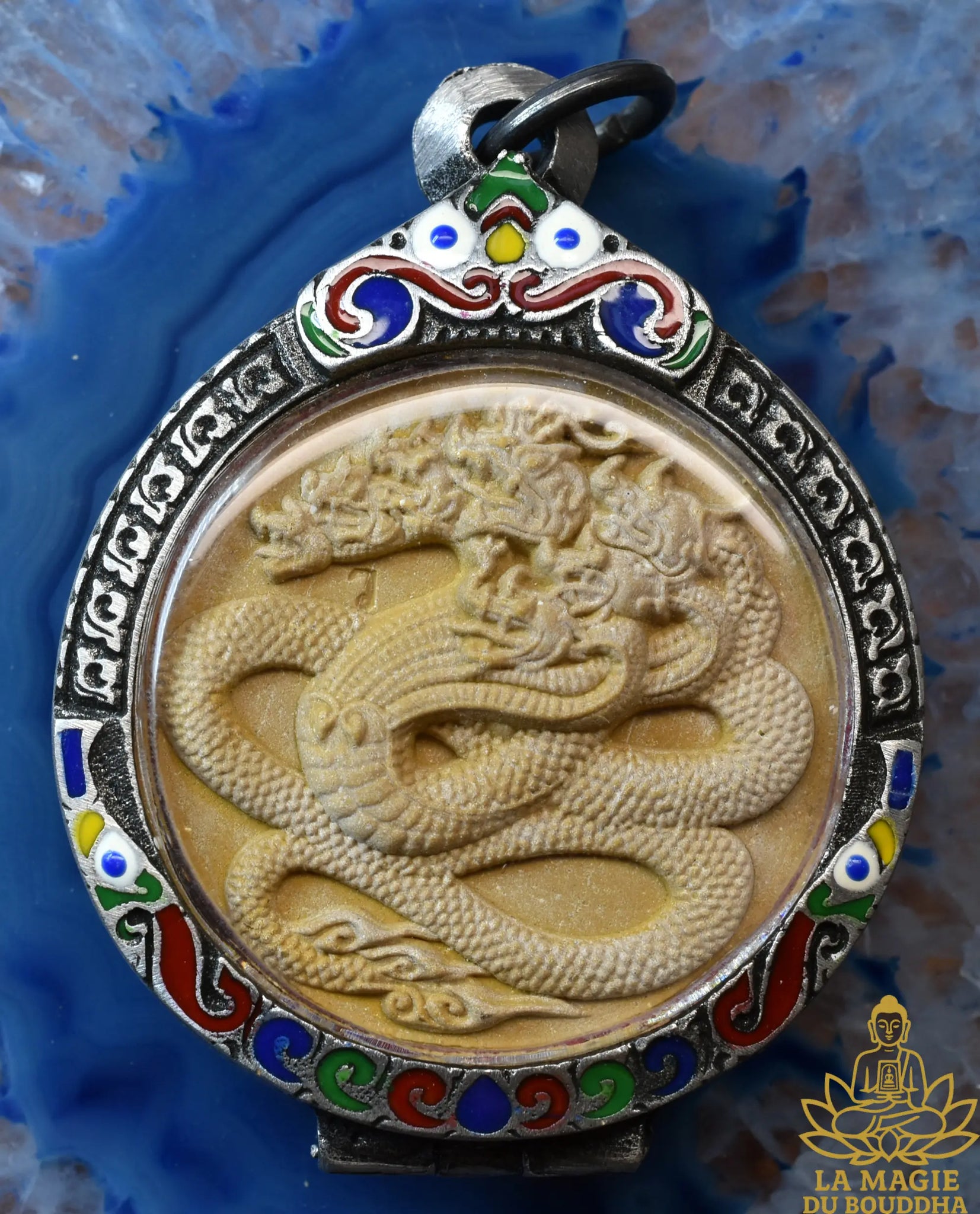 Amulette consacrée en 2007 au Wat Tham Faed (Kanchanaburi) par le vénérable Luang Phor Watchara, dédiée au Roi des Nagas Maha Wet Mahamon et au pouvoir de Maha A Khom (science sacrée Montra).