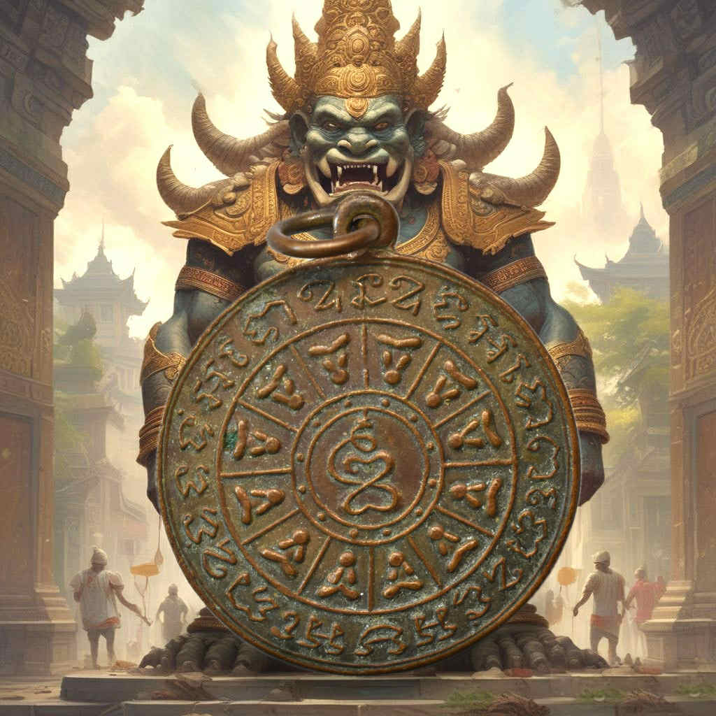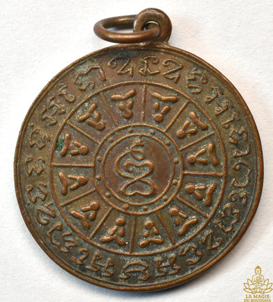 La médaille arbore un ensemble de yantra circulaires et pétales sacrés gravés d’écritures khom, symbolisant la protection, la sagesse et la diffusion des enseignements du Dharma. Le centre met en évidence le symbole des Quatre Nobles Vérités (Ariyasat), cœur de l’enseignement bouddhiste. Sur une face on trouve un pentacle protecteur Phra Pidta Dharmachakra (Roue du Dharma composée de Bouddha protecteurs Phra Pidta).