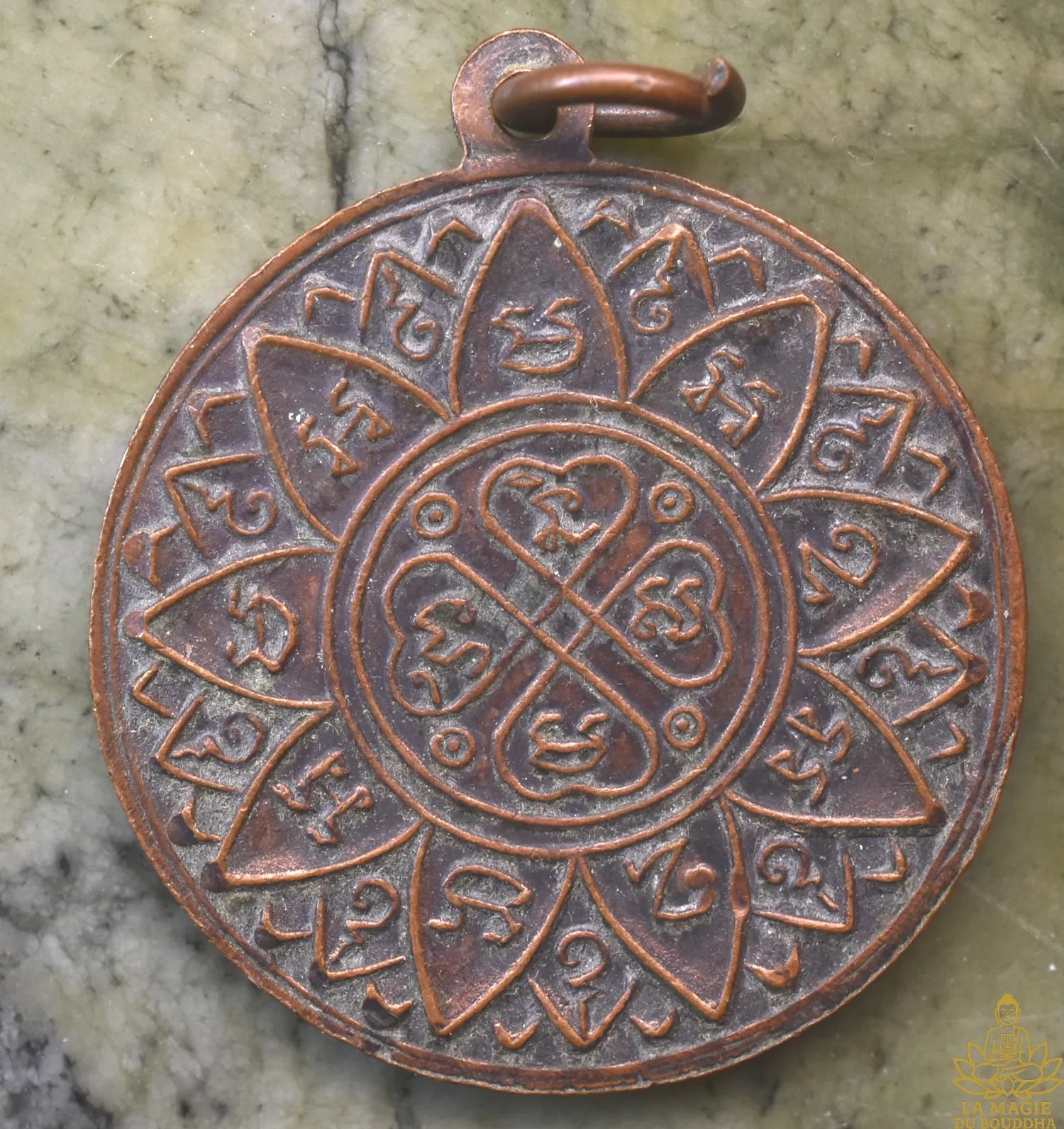 Dans les gravures, les syllabes khom rappellent la voix des anciens maîtres : elles protègent le porteur, l’élèvent spirituellement et dissipent les obstacles karmiques. Porter cette médaille, c’est se relier au souffle éternel du Dharma.