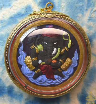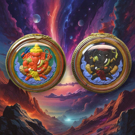 Ces magnifiques amulettes de grande taille, peintes à la main avec des pigments colorés, représentent le Vénérable Luang Phor Thuat d’un côté et Phra Pikanet (Ganesh) de l’autre. Elles ont été consacrées en 2008 lors d’une importante cérémonie au Wat Bang Waek (Bangkok) par le Vénérable Ajarn Noom.