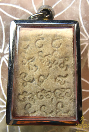 Au verso, on distingue des inscriptions mystiques en écriture khom, formant un ensemble de mantras ésotériques. Ces signes sont réputés amplifier le pouvoir protecteur de l’amulette et relier son porteur aux forces spirituelles invisibles.