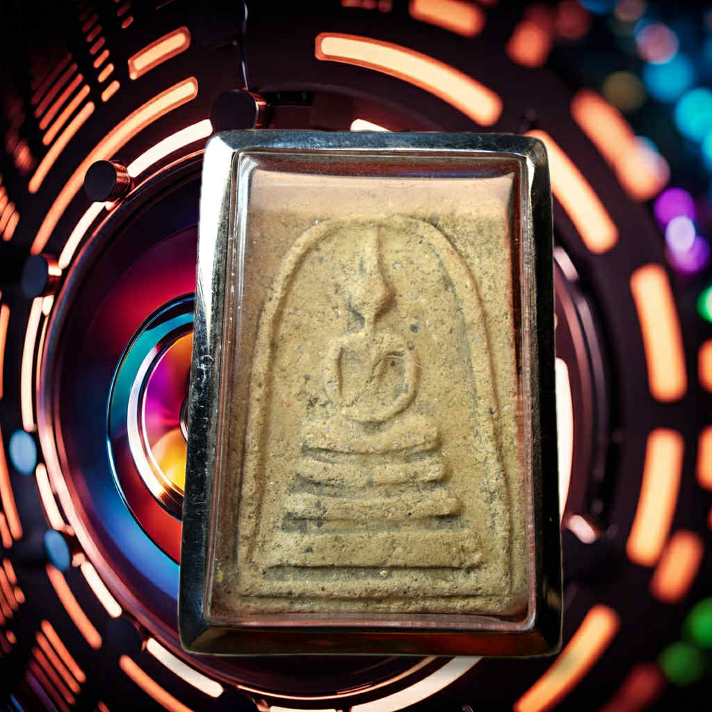 Voici une ancienne amulette Phra Somdej, réalisée en poudre sacrée et conservée dans un reliquaire en acier inox. Cette pièce présente au recto l’image classique du Bouddha assis en méditation sur plusieurs niveaux, symbole de stabilité et d’élévation spirituelle.