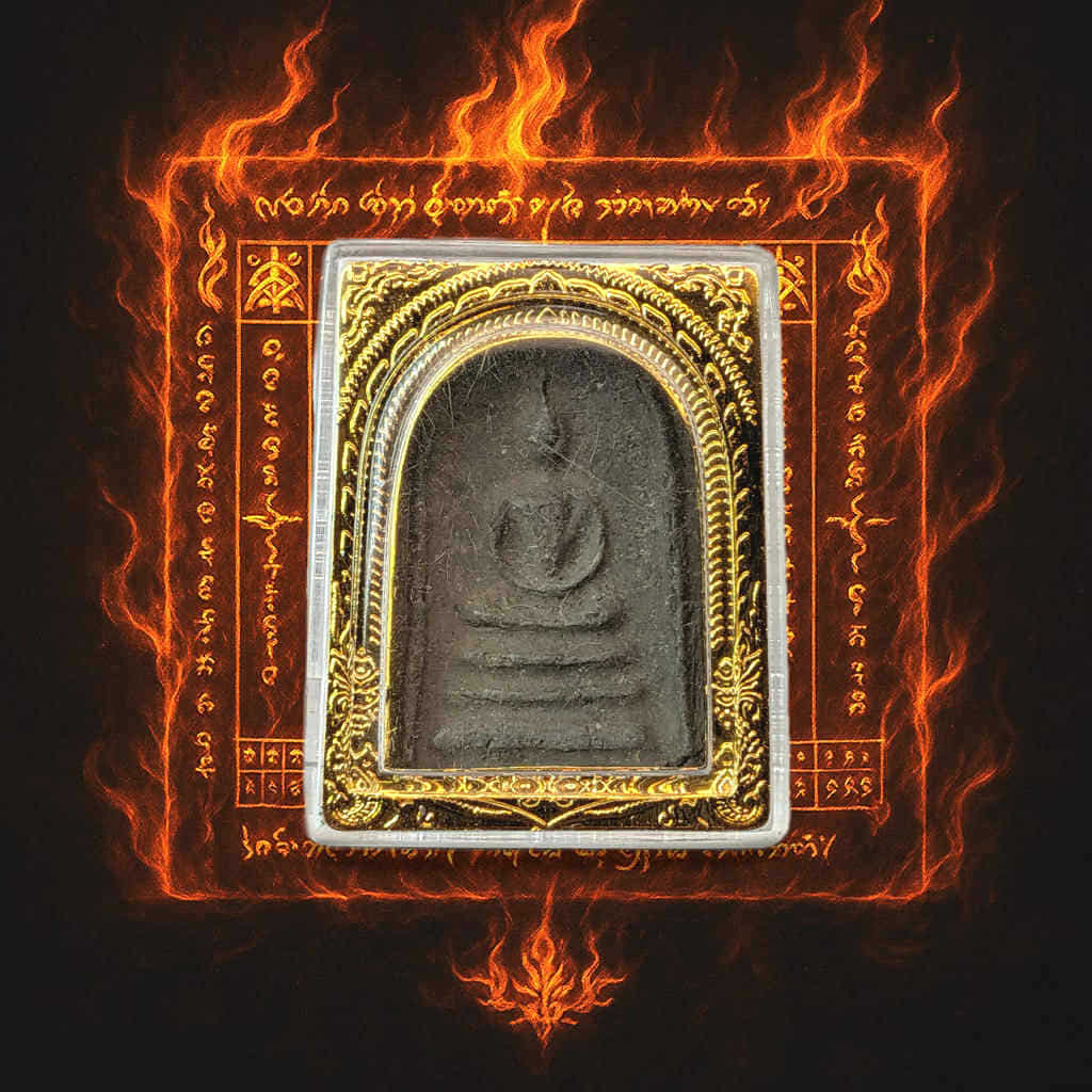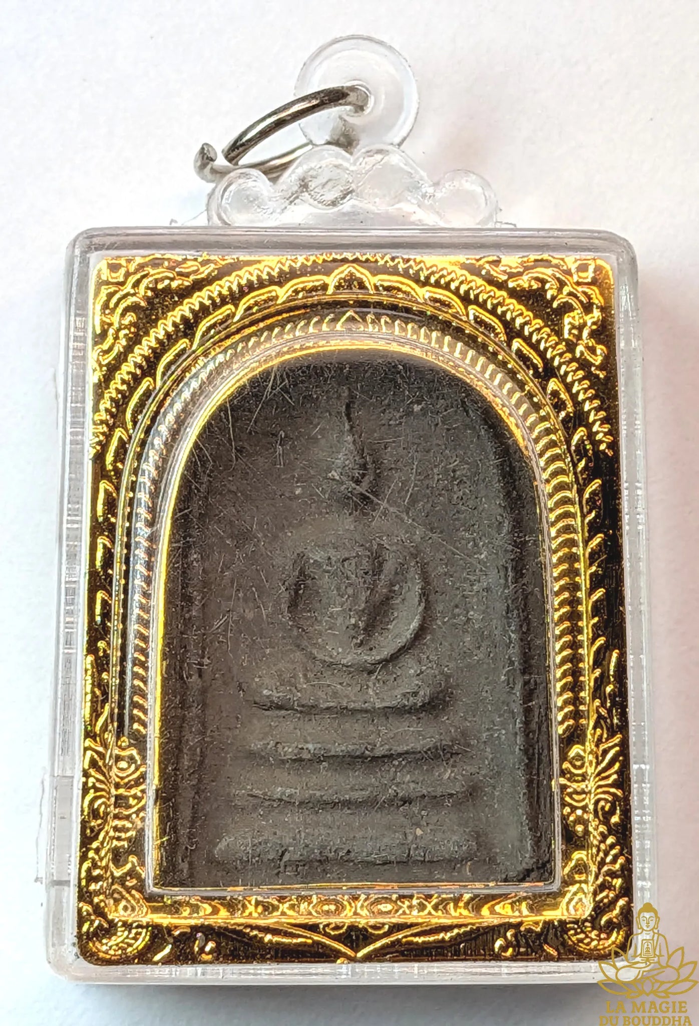 L’amulette a été façonnée à la main, marquée de sceaux au verso (l'année de consécration est également indiquée en chiffres thaï), et se présente dans un reliquaire neuf en acrylique. Elle témoigne de la simplicité, du charisme spirituel du maître et de sa capacité à imprégner ses créations d’une puissante énergie méditative.