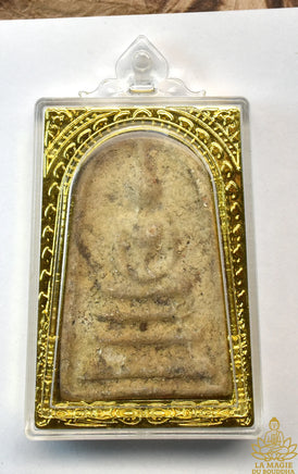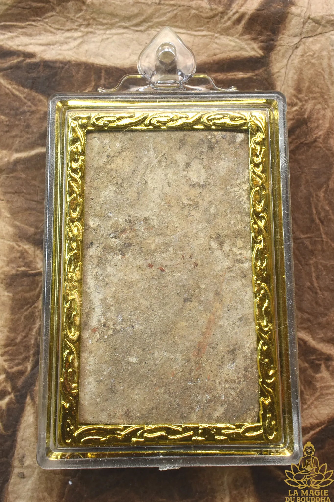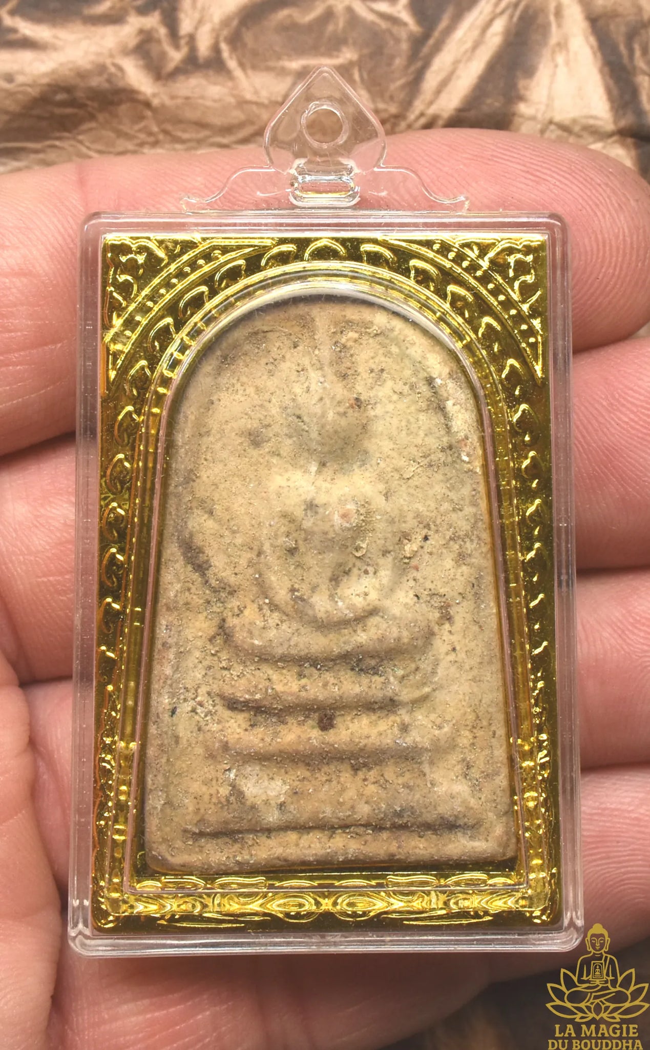 Cette grande amulette ancienne Phra Somdej est un exemplaire rare dont l’origine exacte reste mystérieuse. Le temple d’où elle provient n’a pas pu être identifié, mais la texture de sa pâte sacrée, son usure naturelle et la forme du Bouddha témoignent d’une bénédiction ancienne et authentique. Les amulettes Phra Somdej sont considérées comme les plus saintes du bouddhisme thaï, représentant le Bouddha assis en méditation sur un trône à trois niveaux symbolisant les trois mondes.