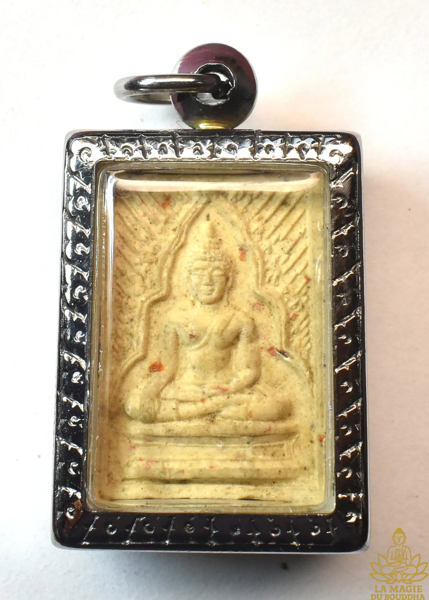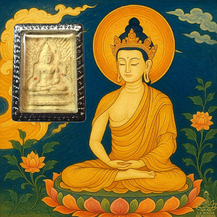 Le revers de l’amulette présente le majestueux chedi du Wat Arun avec une barque naviguant sur la rivière Chao Phraya, symbole de la traversée du samsara vers l’Éveil. Le Bouddha assis en méditation sur la face avant est entouré d’une aura rayonnante représentant la lumière de la sagesse dissipant l’obscurité de l’ignorance.