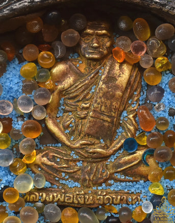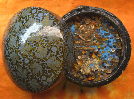 Ce reliquaire ancien en papier mâché peint de motifs floraux dorés renferme une grande amulette en bronze très patiné du très vénérable Luang Phor Ngern (1810 – 1919) du Wat Bang Klan (province de Pijit). Sous l'amulette du vénérable on trouve une pépite de métal doré, de nombreuses perles Sarira multicolores et un sable luminescent bleu évoquant les offrandes célestes.