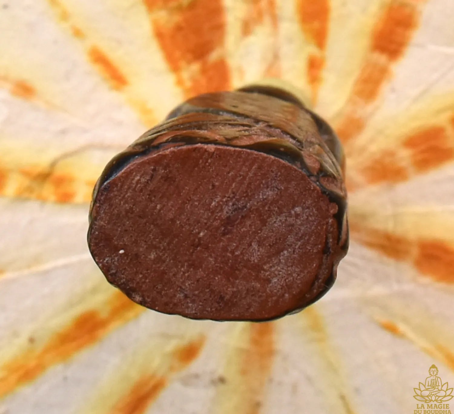 Cette ancienne amulette Lersi sculptée dans une résine végétale noire naturelle dégage une aura mystique rare et profonde. Sa surface polie, marquée par le temps, témoigne de décennies de vénération silencieuse. Le visage de l’ermite, serein et concentré, évoque la sagesse intemporelle de ceux qui ont transcendé les illusions du monde matériel.
