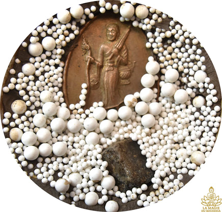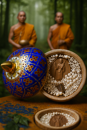 Magie du BouddhaDans le silence d’un ancien monastère, les perles reliques apparaissent comme des étoiles figées dans la matière. Chaque sphère blanche est comme une graine de lumière, un souffle du Dharma cristallisé. La pierre phratat, elle, est un fragment de l’infini, porteuse des bénédictions accumulées depuis des siècles. Protégé dans son écrin Benjarong, ce trésor sacré devient un pont entre les mondes visibles et invisibles.