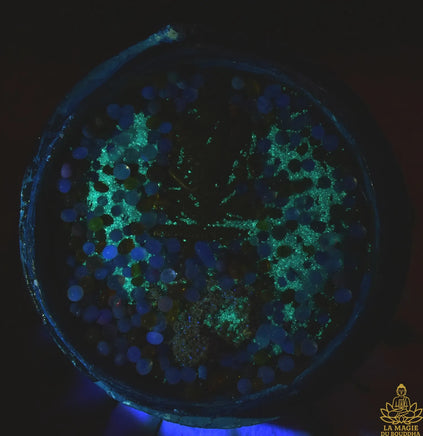J'ai découvert que le sable et certaines des sarira de ce reliquaire réagissent aux UV un peu par hasard car j'ai il y a quelques mois commencé a collectionner les objets en ouraline et "teste" maintenant un peu tout et n'importe quoi avec ma petite lampe magique 🎇
