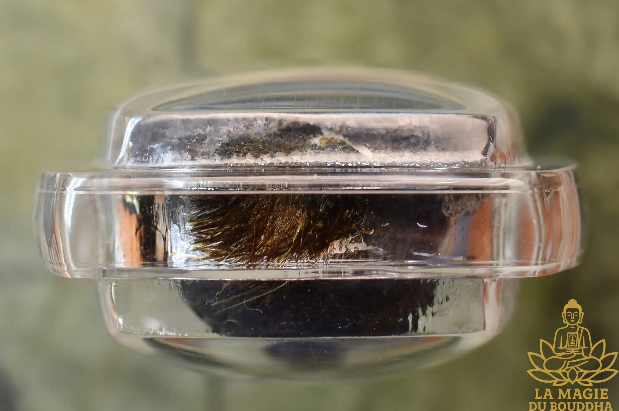 Cette pièce est composée de plomb sacré antique takoa, issu d’anciens lingots retrouvés sous un temple au Cambodge. Elle renferme également des reliques personnelles du vénérable, dont des cheveux et un fragment de robe monastique, ainsi qu’une pastille de peau placée sous l’amulette.