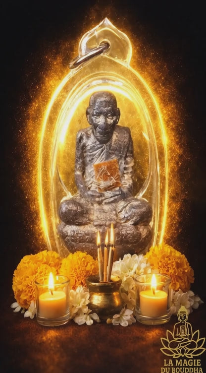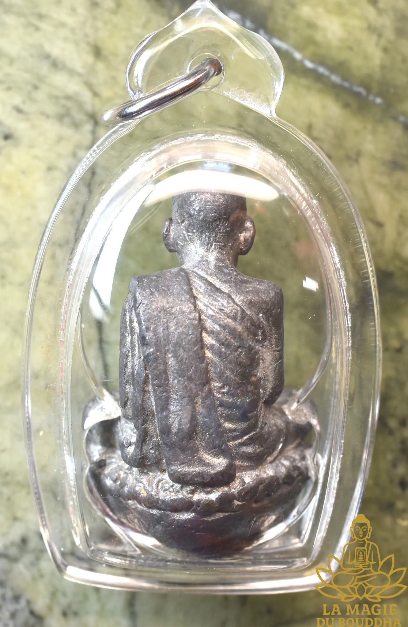 Cette amulette Roop Lor incarne la puissance protectrice et la force spirituelle du vénérable, associée à l’énergie ancienne du plomb takoa et aux reliques sacrées qu’elle contient.