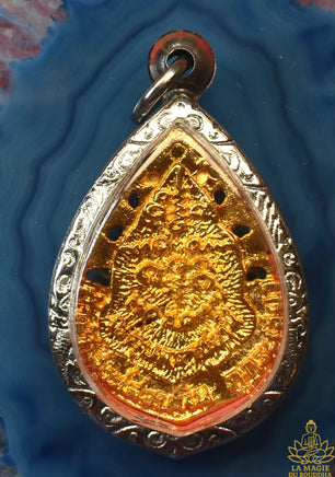 Sur la face avant, le Vénérable apparaît assis en méditation, rayonnant de sérénité et de compassion. Le revers présente un puissant yant solaire symbolisant la lumière de la sagesse triomphant des ténèbres. L’ensemble est recouvert d’une fine couche dorée évoquant la pureté spirituelle et l’illumination intérieure.
