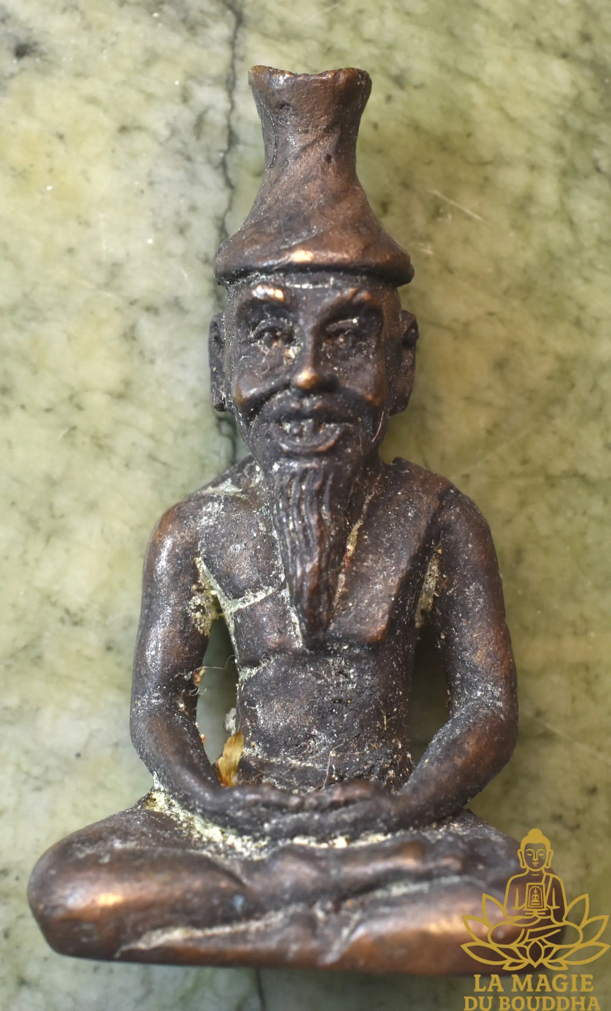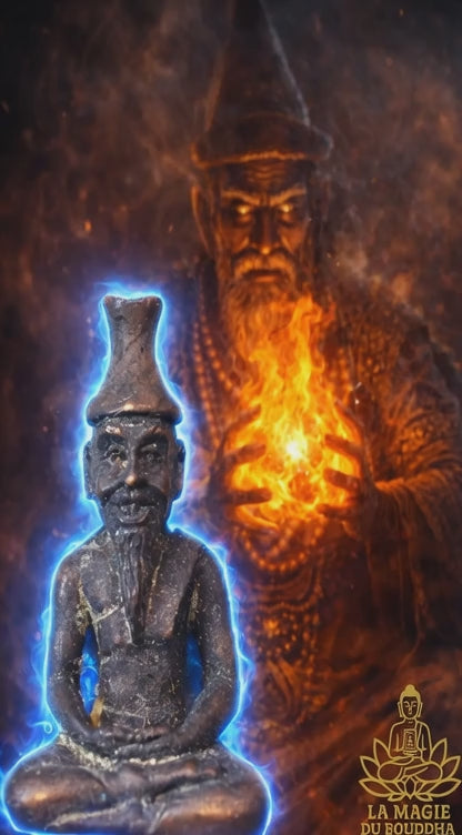 Cette amulette ancienne représente un Lersi (ermite) en méditation, figure incontournable des traditions thaïlandaises liées aux rites d’hommage aux maîtres, notamment le Wai Kru et les cérémonies Krob Kru.