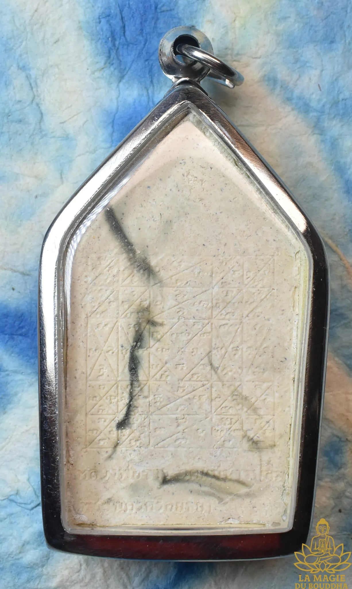 Au revers, on distingue un yant sacré gravé ainsi que des inclusions de poudre noire, typiques des amulettes anciennes confectionnées à la main au Wat Mae Nang Pleum.
