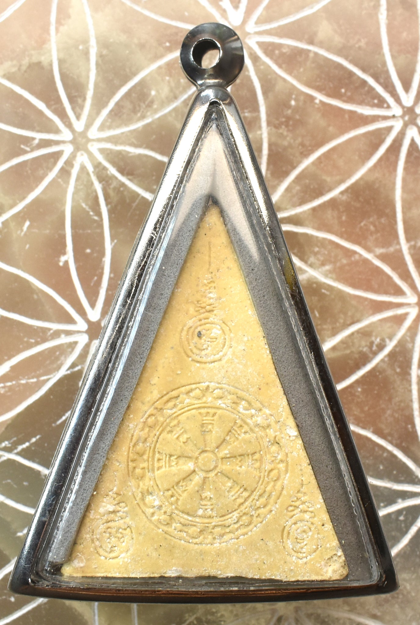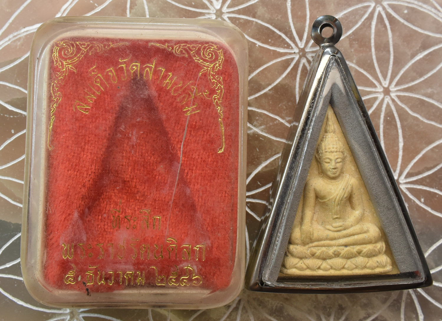 Au fil des années, de minuscules cristaux sacrés (Phra That) se sont formés naturellement au revers de cette amulette, phénomène extrêmement rare dans le bouddhisme thaï, considéré comme un signe de sainteté et d’énergie spirituelle pure. Ces reliques blanches seraient la manifestation de la bénédiction continue des devas et des esprits protecteurs du temple.