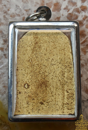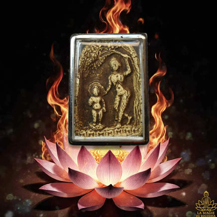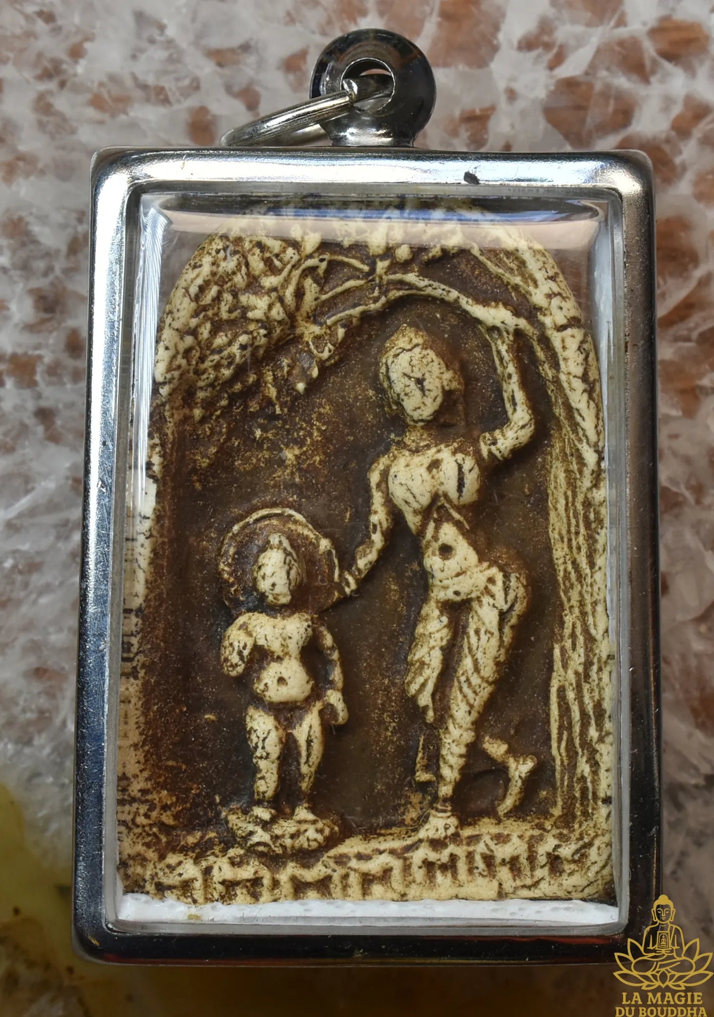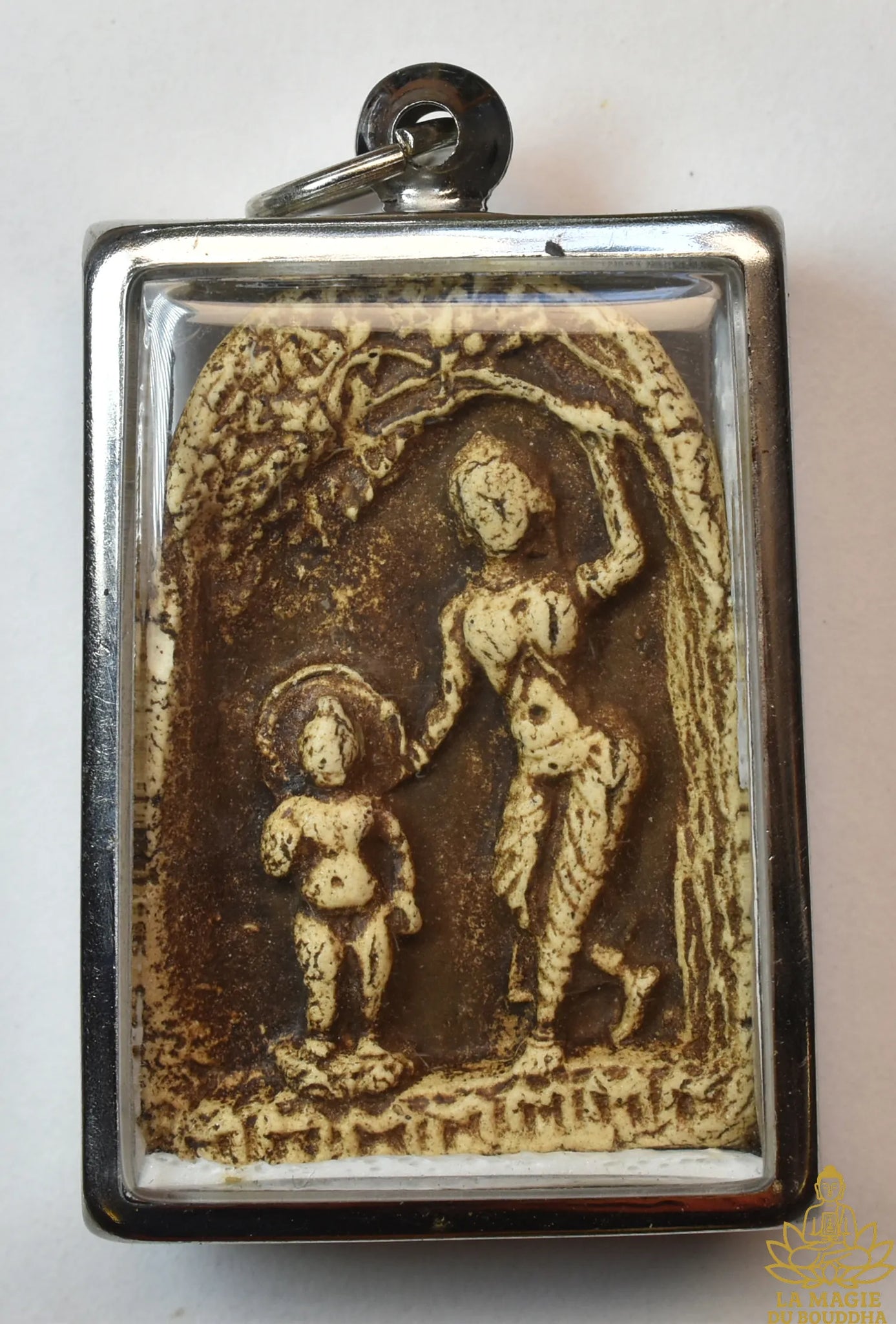 This rare amulet depicts one of the most sacred episodes in the Buddha's life: his birth in the garden of Lumbini. It depicts Queen Mayadevi holding a tree branch, and the young Siddhartha Gautama taking his first steps on earth. The exact origin of this piece remains unknown, but its ancient style and fine reliefs demonstrate a deep respect for classical depictions of this divine event.