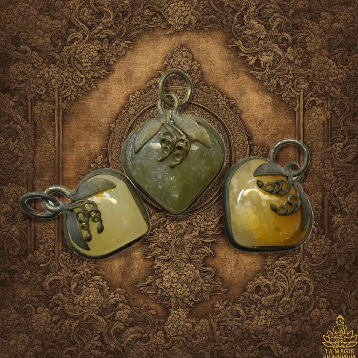 These Hua Jae Yok , "Jade Heart," charm amulets were dedicated in 2007 at Wat Bangren Sakajat (Ayutthaya, Thailand). Jade, a stone of peace and wisdom, is shaped into a heart and then adorned with a discreet decoration of metal leaves and scrolls. Each piece has slight variations resulting from handcrafted assembly at the temple and the use of natural stone.