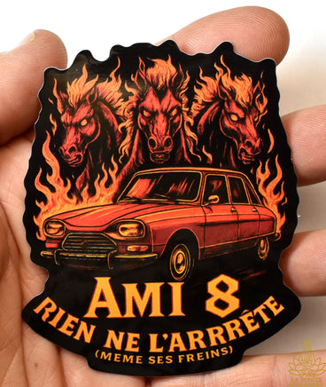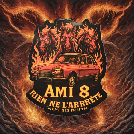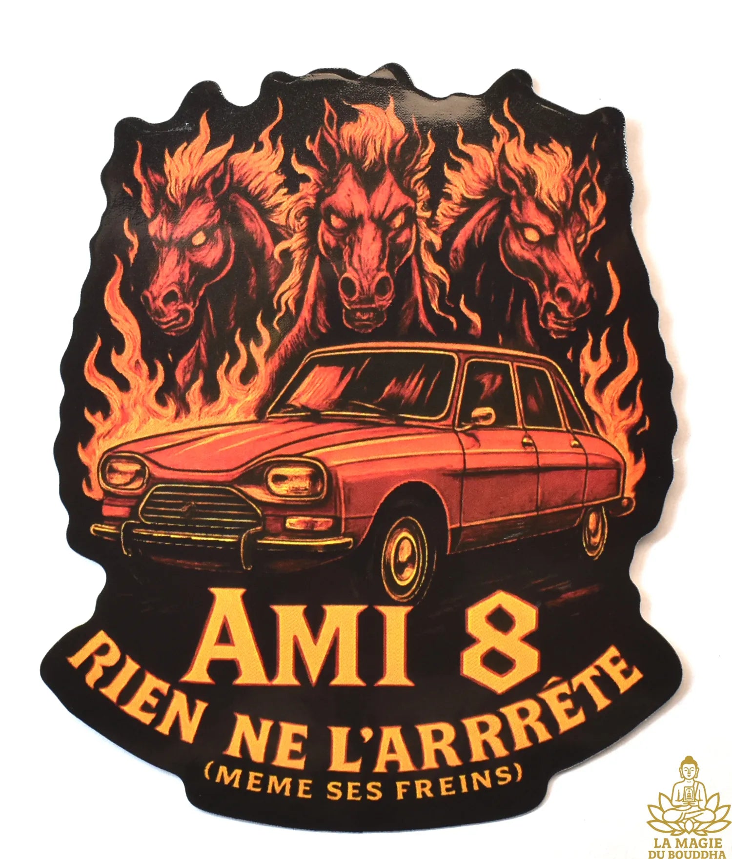 It features the legendary silhouette of the Ami 8, launched like a raging thoroughbred, with its 3 fiery fiscal horsepower, accompanied by a striking slogan: "Nothing stops it (even its brakes)" . Ideal for displaying your mechanical savvy on your car, your fridge, your PC or even your workbench.