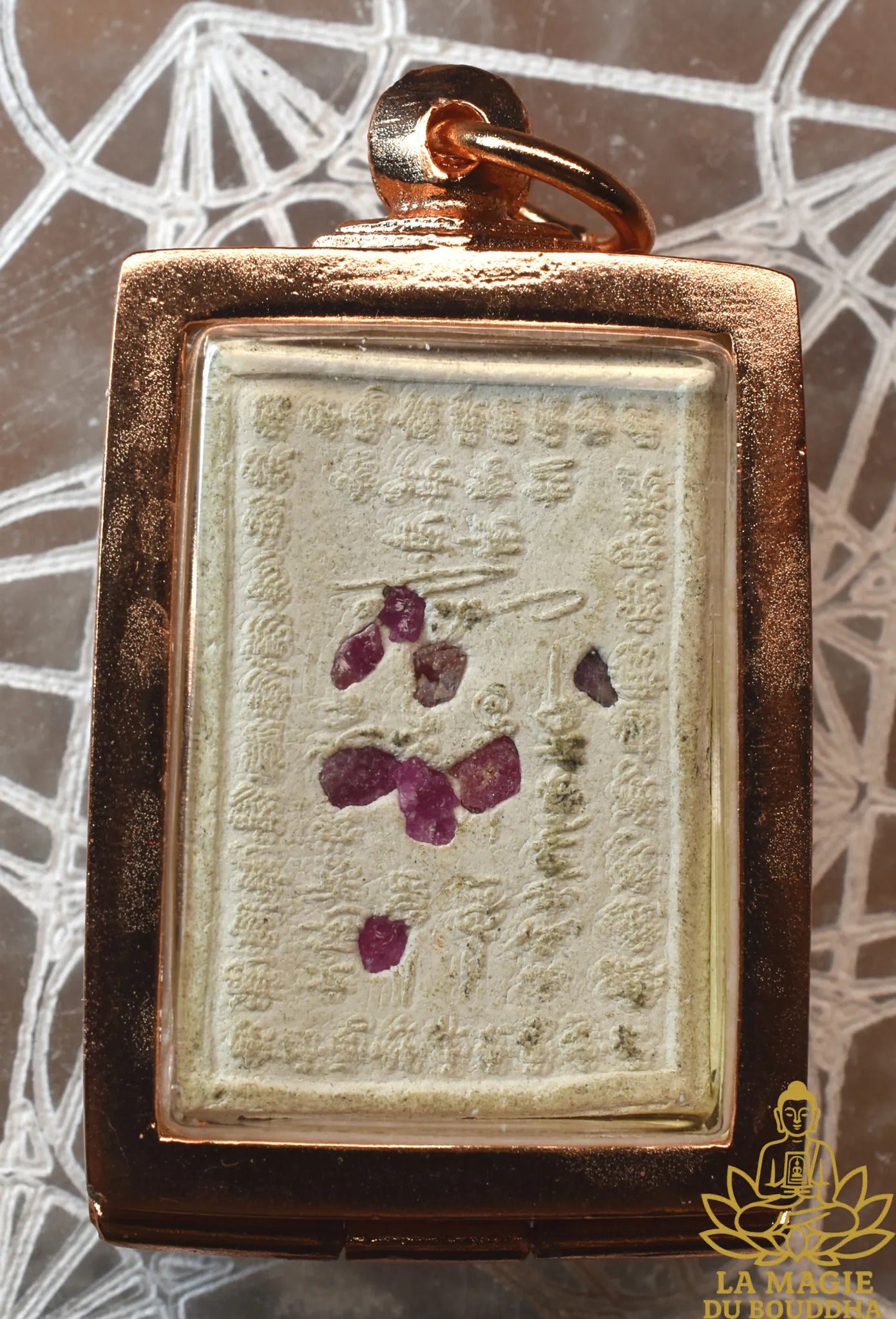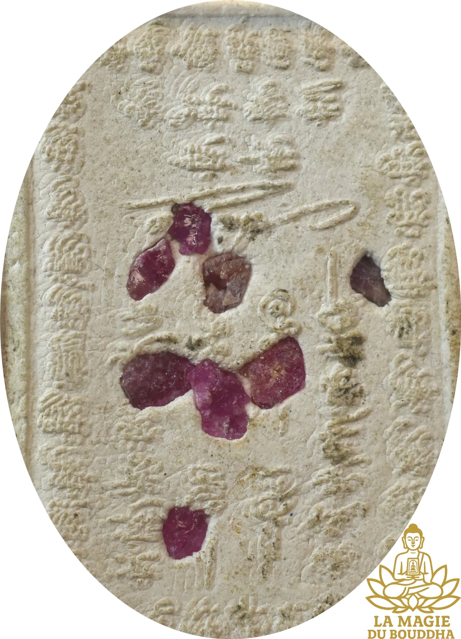 On the reverse, one can distinguish red Phratat relic stones ritually integrated, accompanied by the handwritten signature of Kruba Krissana, attesting to the authenticity and spiritual consecration of the amulet.