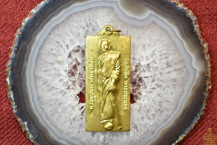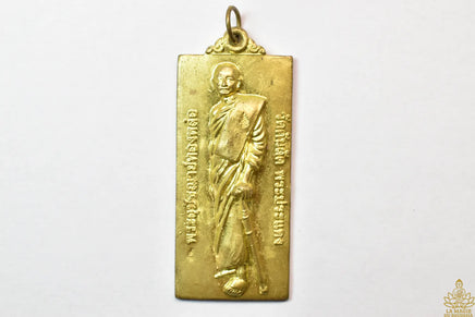 This rare and precious medal pays homage to the Most Venerable Phra Upacharya Thonglor , respected master of Wat Khanlat , in the province of Samut Prakan . Made of gilded alloy , it represents the venerable one on the move, carrying his pilgrim's staff and the traditional monastic habit.