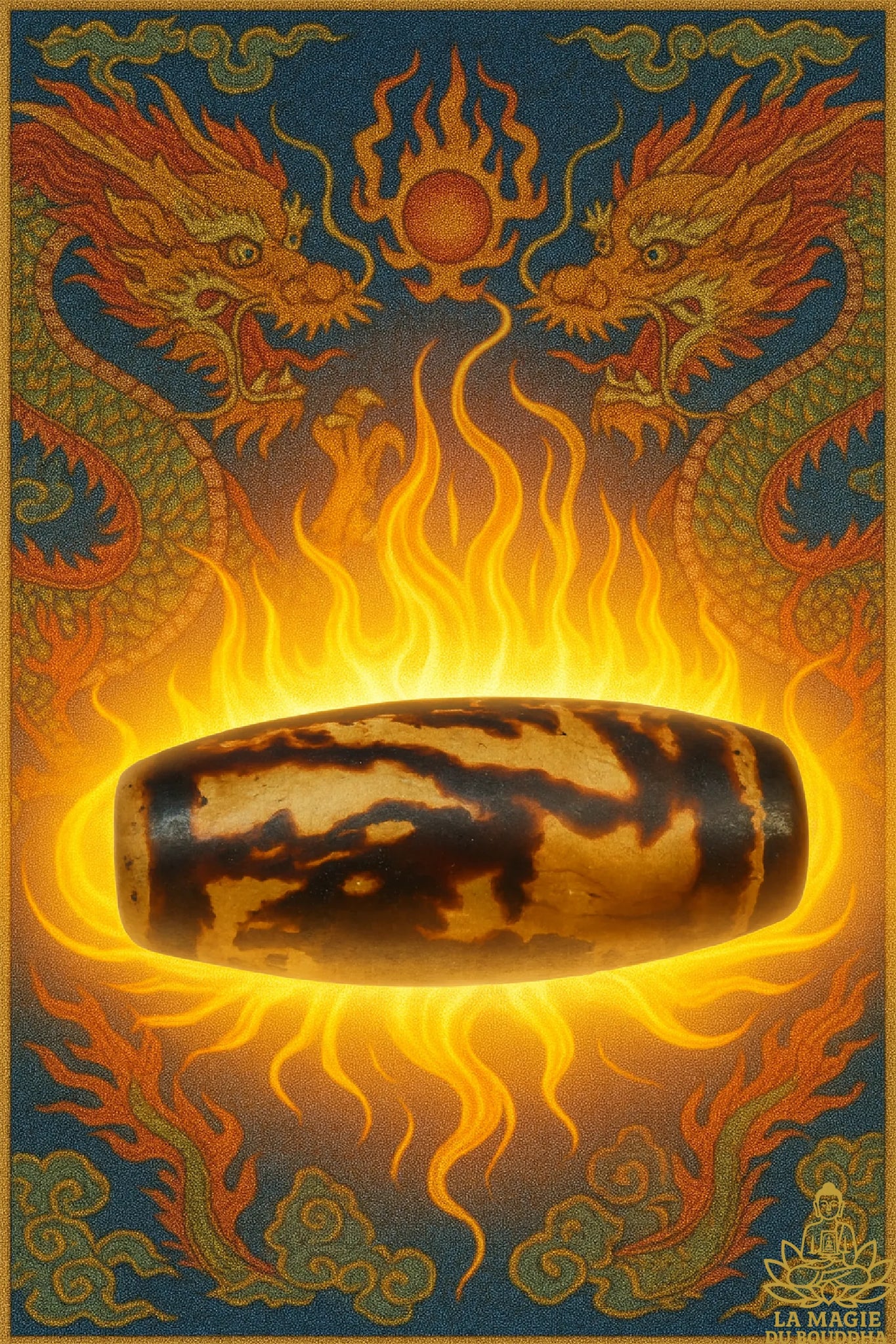 The dragon motif enhances the Dzi's energy: it is the guardian of hidden treasures, the master of the elements, and the embodiment of life force. Wearing a dragon Dzi attracts good luck, removes obstacles, and bestows natural authority and charisma.