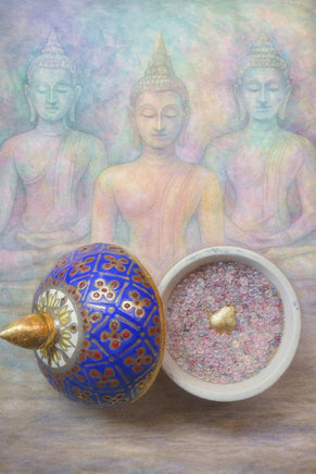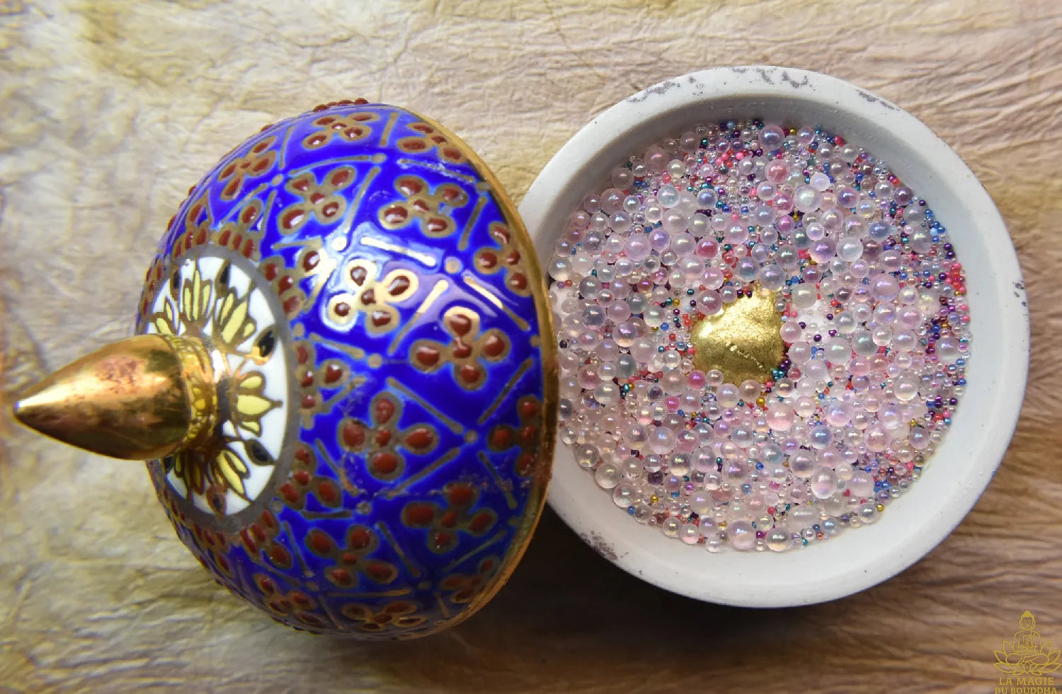 At their center lies a fragment of sacred golden metal , probably from an ancient temple bell , a symbol of the call to the Dharma and the sacred vibration that resonates through the centuries.