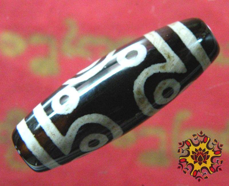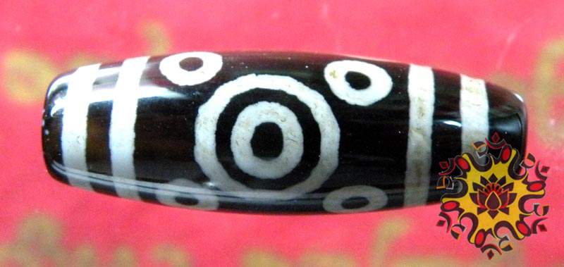 The five eyes on the upper part of this type of Dzi represent the five Dhyani Buddhas which represent the five aspects of the Adi Buddha (Buddha primordia) and the five wisdoms allowing the sublimation of the five negative emotions into positive energy.