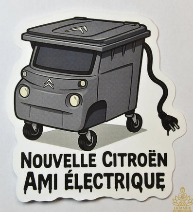 This humorous sticker wittily reworks the famous electric Citroën Ami by transforming it into a fun, trendy wheelie bin . A biting wink for vintage car enthusiasts and collectors of automotive humor!