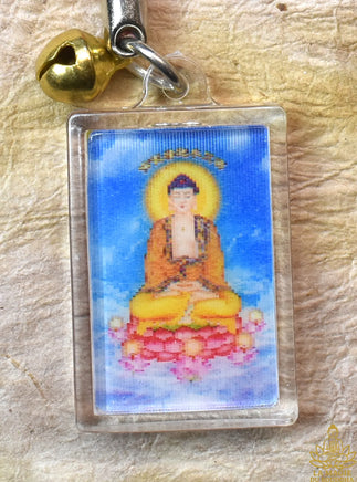 Cette belle amulette du Bouddha Amitābha est présentée sous forme de porte-clé protecteur, ornée d’un fond céleste bleu et du Bouddha assis sur un lotus rayonnant. Elle contient en son cœur la prière de renaissance en Terre Pure (往生咒 – Wǎngshēng Zhòu), soigneusement pliée et scellée dans le reliquaire étanche.